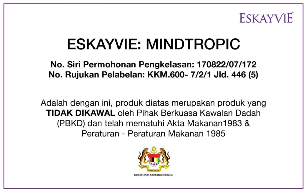Pengesahan bahawa Eskayvie Mindtropic Selamat Digunakan & Mematuhi Akta Peraturan-peraturan Makanan.